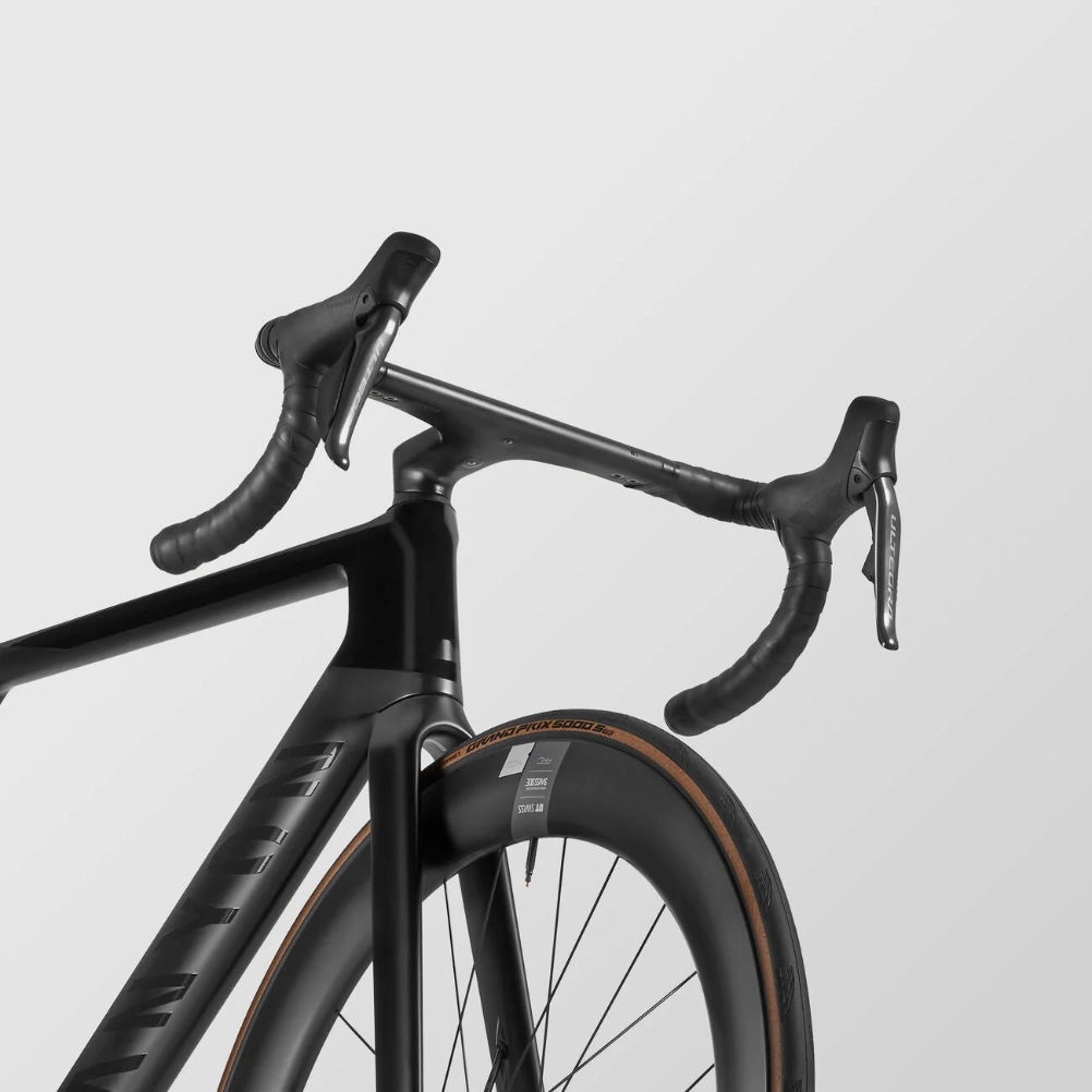 • Manillar y potencia: Cuenta con un manillar integrado y una potencia aerodinámica que mejoran la eficiencia aerodinámica de la bicicleta y permiten una posición cómoda y agresiva.