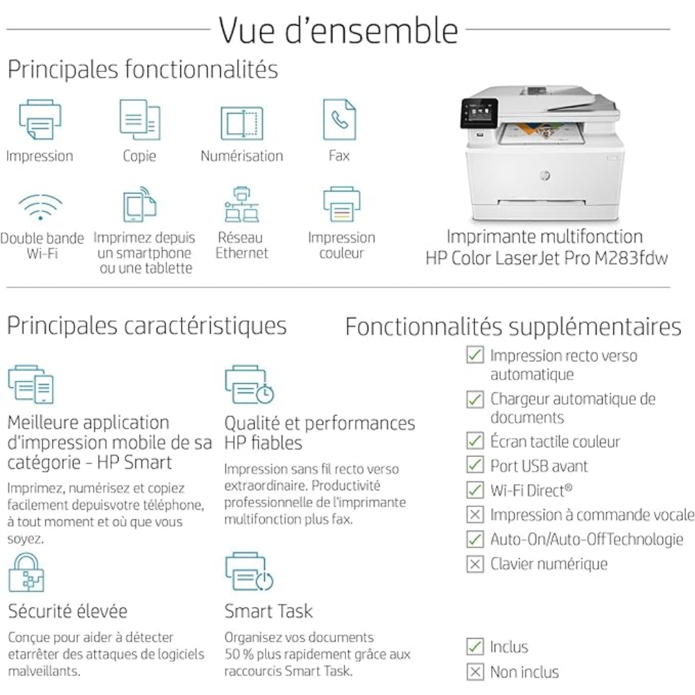 En résumé, la HP Color LaserJet Pro M283fdw est une imprimante tout-en-un fiable et polyvalente, idéale pour les utilisateurs à domicile ou les petites entreprises qui ont besoin d’une qualité d’impression professionnelle et de fonctionnalités avancées.