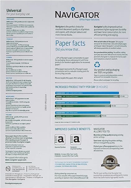 Navigator Universal to wysokiej jakości papier biurowy przeznaczony do wszechstronnego zastosowania w drukarkach i urządzeniach biurowych. Produkt oferuje doskonałą wydajność zarówno w drukarkach atramentowych, jak i laserowych, zapewniając wyraźne i ostre wydruki.