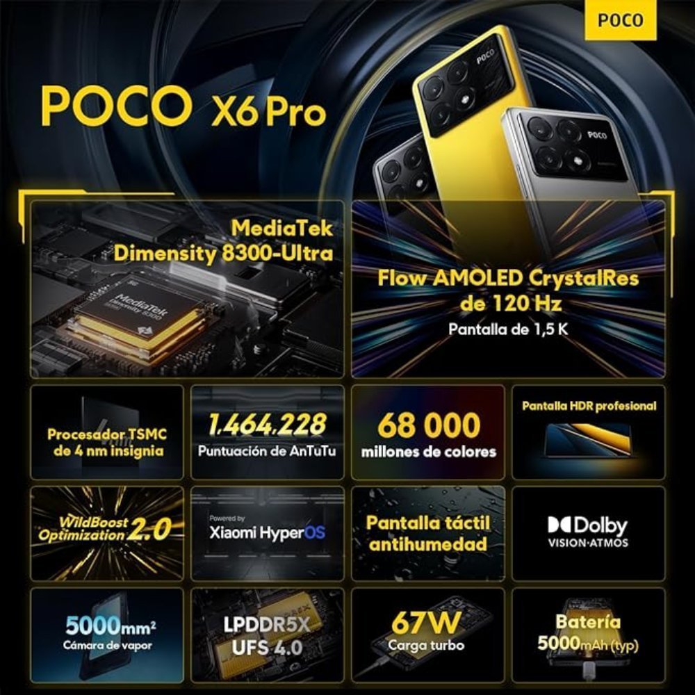 Poco X6 Pro – Smartphone de 12+512GB, Pantalla AMOLED de 6.67” 120Hz 1.5K, MediaTek Dimensity 8300-Ultra, Triple cámara de hasta 64MP, 5000mAh, Negro (Versión ES) Original