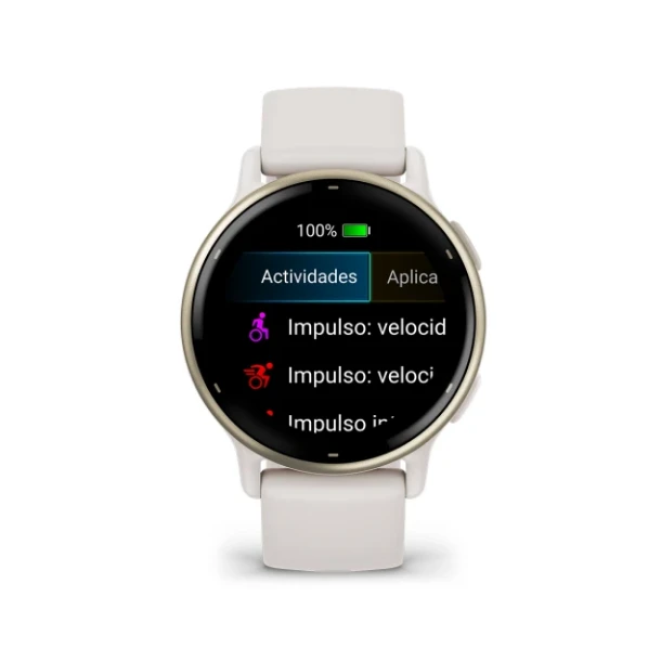 1. Diseño Sofisticado: El bisel de aluminio blanco gold agrega un toque de sofisticación y estilo, convirtiendo al vívoactive 5 en una pieza llamativa que complementa tu estilo de vida activo.